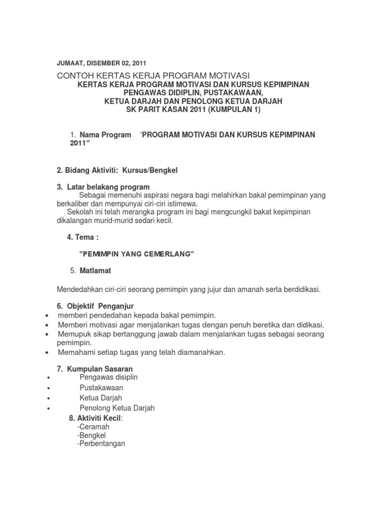 83 contoh kertas kerja program. Kertas kerja dasar program motivasi jatidiri kepimpinan dan pembinaan sahsiah (permata) 1.0 pengenalan: Kertas kerja hari anugerah senarai nama ajk/ pengarah program catatan imam: Coba cari dan pikirkan hal apa yang bisa membantu membantu. Program motivasi kecemerlangan upsr merupakan projek mega yang dikelolakan hasil kerjasama bersama guru pelatih program internship dari dua opsyen berbeza iaitu pismp pendidikan jasmani.
