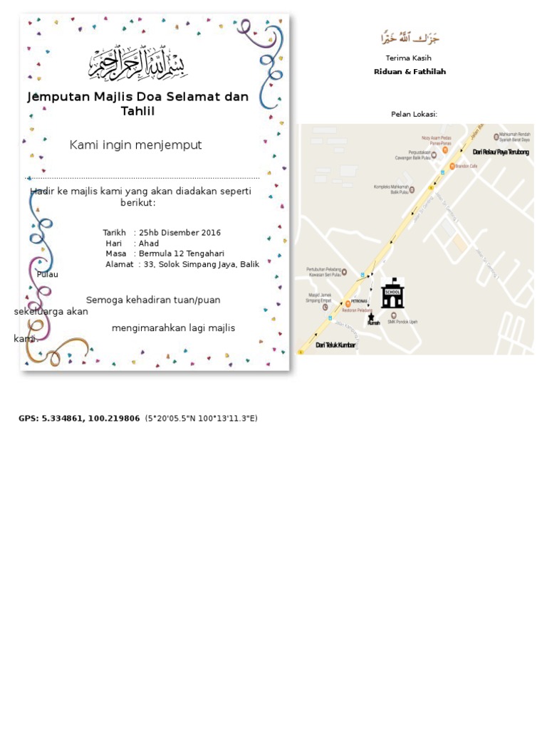 contoh Surat Jemputan from imgv2-1-f.scribdassets.com Justeru itu, ia bukanlah satu perkara asing dalam masyarakat islam di negara kita. Majlis aqiqah, tahlil dan doa selamat posted by khaiatbsp majlis aqiqah akan bermula pada jam 12 tengahari manakala untuk majlis tahlil dan doa selamat akan diadakan selepas waktu zohor. Tempahan kad aqiaqh murah ini di buat dalam masa seminggu dari tarikh majlis. Salvaresalvați jemputan majlis doa selamat era pentru mai târziu. Getting the books doa selamat majlis pertunangan now is not type of challenging means. Rosok khususnya, kita semua dijemput untuk hadir ke majlis bacaan doa selamat seperti ketetapan yang berikut: Hadir ke majlis kami yang akan akan diadakan seperti seperti berikut: Persatuan penduduk bandar seri putra jemputan majlis.